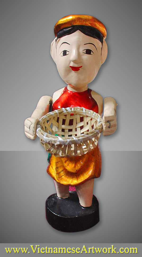 These water puppets are REAL! They are designed and hand made by the artist, Nguyen Quoc Hung, who is making water puppets for the Thang Long Water Puppet Theatre in Hanoi. All the water puppets in this group are made with the same size with the real performing puppets in the theatre. We also have some pictures, action shots, of the same characters in the water puppets shows. All the pictures are from the Thang Long Water Puppet Theatre.